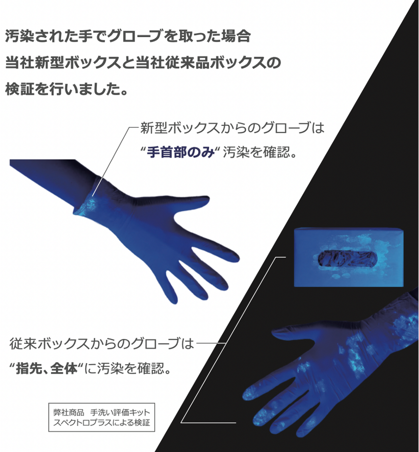 「複数のスタッフがグローブボックスに手を入れる。」 「グローブがくっついて出てきてしまう。」 「取り出し過ぎたグローブをボックスに戻す。」 グローブは使用前から微生物に汚染されている可能性があります。 グレイシアゼロは特許梱包製法によりグローブの感染リスクを最小化。 手首部分から一枚ずつ確実に取り出しが可能です。 グローブボックス内に指を入れたり、出過ぎたグローブを戻す状況が発生しないので、最後までボックス内が汚染されません。
