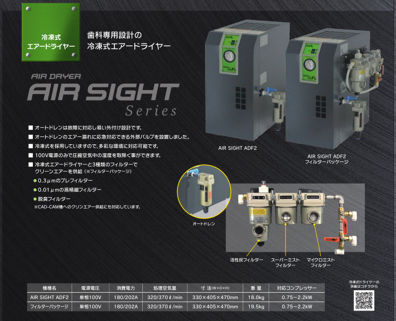 信頼性の高い冷凍式エアードライヤー 機器故障率の高いオートドレンのエアー漏れ時にも対応出来るコックを外部に装備した歯科専用設計品 オプションのフィルターをセットすれば除菌エアーも供給可能となります。