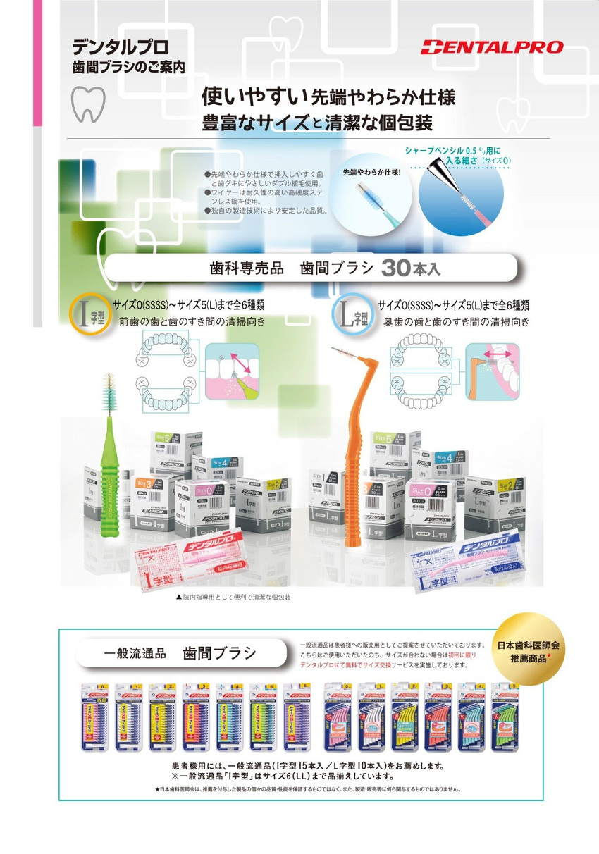 前歯に適したI字型と奥歯に適したL字型の2タイプをご用意しました。 院内指導用と患者様用がございます。 患者様用は予防歯科の歯間ブラシとしては初となる『日本歯科医師会推薦商品』です。 患者様用のみご使用の途中でサイズが合わないと感じた場合に、使用途中の商品を送っていただく事でそれよりも太い(もしくは細い)サイズに無料で交換できる「サイズ交換サービス」を実施しております。 折れにくく、抜けにくいデンタルプロ歯間ブラシを是非ご検討ください。 【院内指導用】(全6種類) 〇I字型30本入、L字型30本入共に(サイズ0〈SSSS〉~サイズ5〈L〉) 【患者様用】※サイズ交換サービス有り 〇I字型15本入(サイズ0〈SSSS〉~サイズ6〈LL〉全7種類) 〇L字型10本入(サイズ0〈SSSS〉~サイズ5〈L〉全6種類) 関連文献 出典:日本歯科衛生学会雑誌 Vol.17 No.1、2022 年 8 月発行、34 頁-41頁【※インテージSRI+データ2021年4月〜2022年3月】