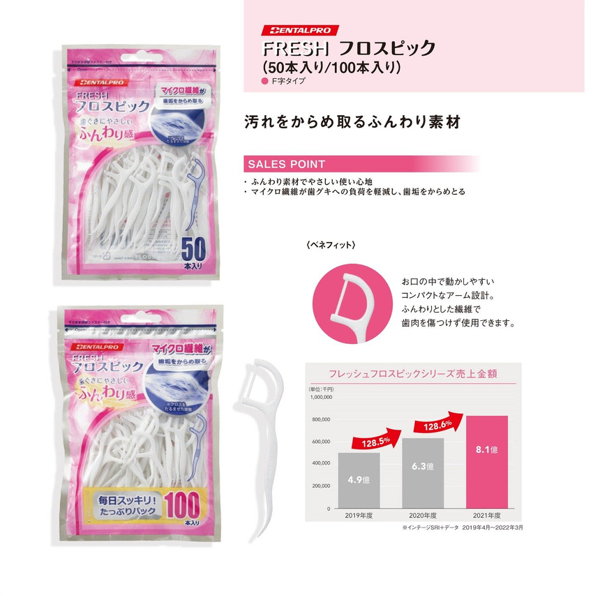 歯間ケア用品をこれから使用する方に、ふんわり素材でやさしい使い心地のフロスピックをご紹介させていただきます。 お口の中で動かしやすいコンパクトなアーム設計で、マイクロ繊維が歯グキへの負担を軽減し歯垢をからめ取ります。またハンドル後端はつまようじとして使えるピック付きとなっております。 袋は開閉可能なジッパー付き袋となっておりますので、保存時に袋から飛び出す心配もありません。 毎日使えるようリーズナブルな設定でコストパフォーマンスを実現しました。 人気の50本入と朝・昼・晩と都度ご使用されるヘビーユーザー用に100本入の2タイプをご用意いたしました。 〇フレッシュ フロスピック 50本入 〇フレッシュ フロスピック 100本入