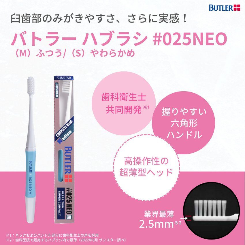 業界最薄2.5mmの超極薄ヘッドなので、狭い口腔内でもハブラシを動かしやすく、最後臼歯遠心面などプラークコントロールの難しい部位にも毛先がしっかり届きます。スリムロングネックなので、嘔吐反射が強い方、開口量が少ない方にもおすすめです。