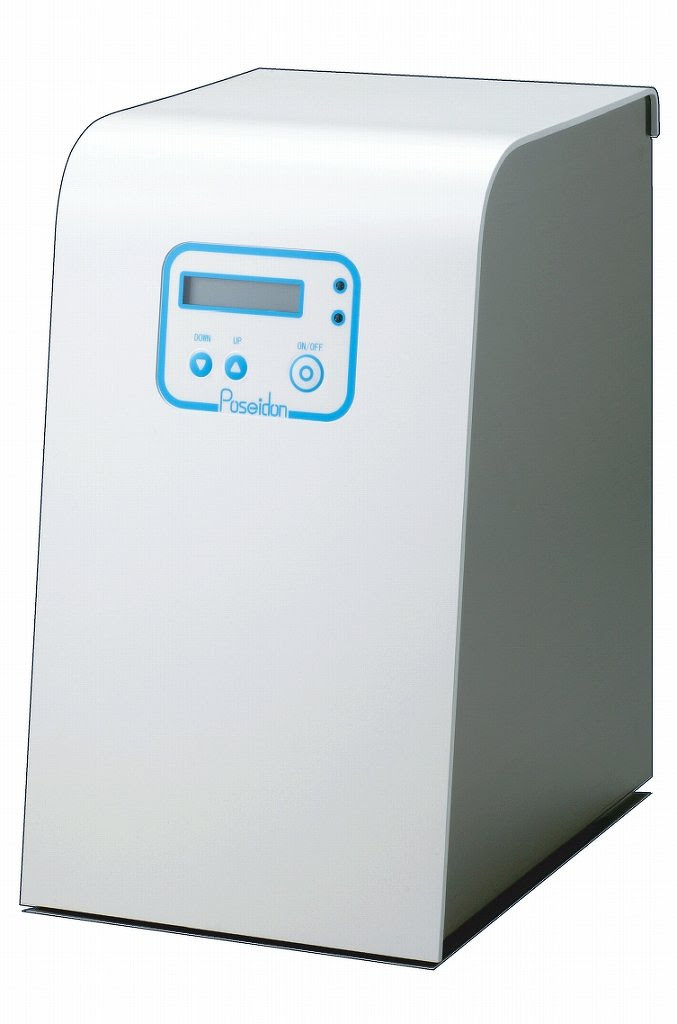「ポセイドン」により、人にも機器にもやさしい衛生的な治療環境が整います。 ①「ポセイドン」は、水道水中の塩化物イオンを電気分解することにより、残留塩素濃度を適正補正することにより、治療に使用されるお水の清浄化が期待できます。 ②水道水の流れをセンサーが感知し、電気分解を始めるため、日々の添加物を入れる作業や、清掃メンテ作業が必要ありません。 ③ポセイドンから生成される除菌水は塩分の添加は不要で「中性」であるため、歯科ユニットへ通水してもチューブの劣化や金属腐食の心配はありません。 ④無添加の電気分解ですので、残留塩素濃度の過度な上昇も抑えられ、試験機関にて飲用適とされております。 ⑤電極ユニットやフィルターの働きにより、水道水中の鉱質分(カルキ)やサビ等の汚れが除去されるため、院内での水詰まりの解消が期待できます。